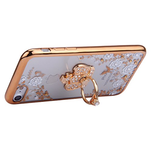 Ukayfe Custodia Resistenti per iPhone 7/8, Confine di placcatura Disegni Bella Vintage Elegante Trasparente Clear View Ultra Slim Sottile Morbida Soft TPU Silicone Gomma Gel Intarsiato Vans Glitter Brillantini Bling Diamante e Colorate Fiore Dipinto, Particolari Fantasia Lusso per Donna Ragazza Antiurto Protettiva Rigida Anti-scratch Cover Case Custodia Bumper -D'oro-Fiore bianco con Corona imperiale supporto