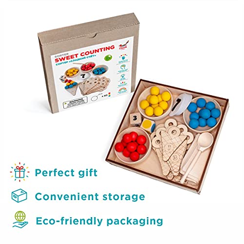 Include 30 palle di legno, 3 ciotole di legno, un cucchiaio di legno, 10 coni gelato di legno con i numeri, 2 dadi di legno con colori e numeri, carte con i colori, numeri, simboli matematici e compiti;