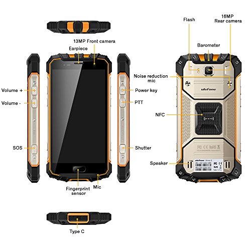 Ulefone Armor 2 Smartphone 4G Android 7.0 (Helio P25 Octa Core 2.6GHz, 5.0" FHD Schermo, 6GB RAM 64 ROM, 16MP+13MP Camera, Fingerprint ID, Dual SIM, Dual band WIFI, 4700mAh Batteria, Carica rapida, Tipo C, OTG, NFC, HIFI, GPS, FM) Oro