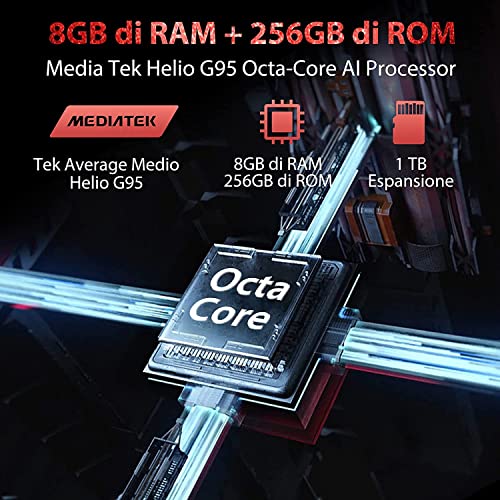 ✈️【Helio G95 Processore & 8GB + 256GB】Supportato dal chipset MediaTek Helio G95, è dotato di due potenti core Arm Cortex-A76 con una frequenza principale fino a 2.05 GHz e sei core Cortex-A55 che si concentrano sull'efficienza, fornendo un funzionamento rapido e regolare e garantendo il tuo smartphone tiene sempre il passo con la tua velocità di navigazione. Con 8GB di RAM e 256GB di ROM, anche gli standard di gioco più esigenti possono essere facilmente soddisfatti o eseguiti senza barriere.