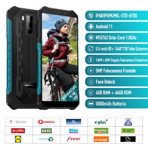 Ulefone Rugged Smartphone, Armor X9 Pro Cellulare Antiurto con 5.5" HD+, 4GB RAM+64GB ROM Octa-core, 5000mAh Batteria, 13MP+2MP, Android 11 Telefoni Cellulari 4G, NFC/GPS/OTG/Dual SIM-Verde