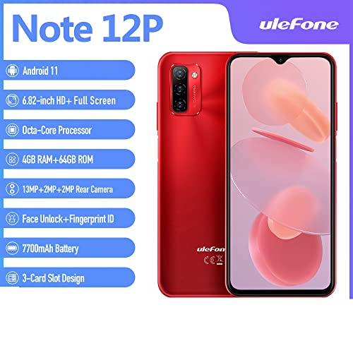Ulefone Note 12P Smartphone (2022), 7700mAh Batteria, 6,82" HD+ Schermo, Android 11 Octa-Core 4GB + 64GB, 13MP Triple Telecamera + 8MP Fotocamera, Dual SIM 4G Cellulari Offerte Rosso