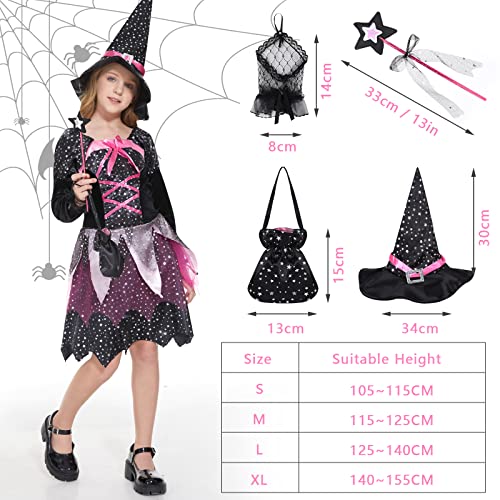 Costume da Strega per Bambini Taglia: S è adatto per 3-4 anni (adatto per 105-115 cm), M è adatto per 4-6 anni (adatto per 115-125 cm), L è adatto per 7-9 anni (adatto per 125-140 cm), XL è adatto per 10-12 anni (adatto per 140-155 cm)