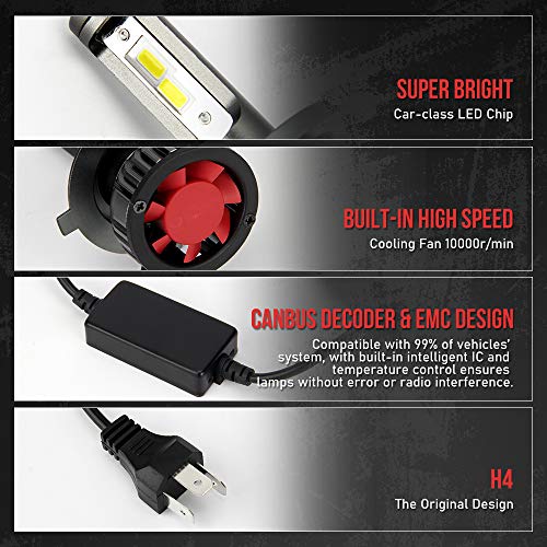 ★ 【 Lampadine H4 HB2 9003 Hi/Lo Led 】 (confezione da 2) 6500K Xenon bianco, funzionamento a 48W (24 W per lampadina). Durata lunga: 30.000 ore, tensione di funzionamento: 9-16 V CC (compatibile). Veicoli 12 V. ). Uscita 4400 lumen (2200 lm per lampadina). Alta luminosità ed estremamente luminosa.