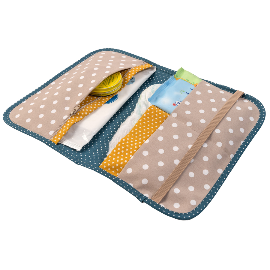 Dettagli del prodotto: Spazio sufficiente per 3 pannolini (fino alla taglia 5), 1 confezione di salviette umidificate, 1 confezione di flanelle umidificate, assorbenti per l'allattamento, crema detergente, cipria e piccoli utensili. Chiusura elastica Composizione: 2 tasche grandi, 1 tasca con zip, 2 tasche piccole Nella cerniera è possibile riporre in modo igienico un ciuccio di riserva. Materiale e cura: Materiale: 100% cotone Lavabile fino a 40°C Tessuti di cotone certificati secondo lo standard OEKO-TEX®, classe di prodotto I Dimensioni e peso: Dimensioni: aperto: 36x27 cm, piegato: 18x27 cm Peso: 424 g La fornitura comprende 1 borsa per pannolini
