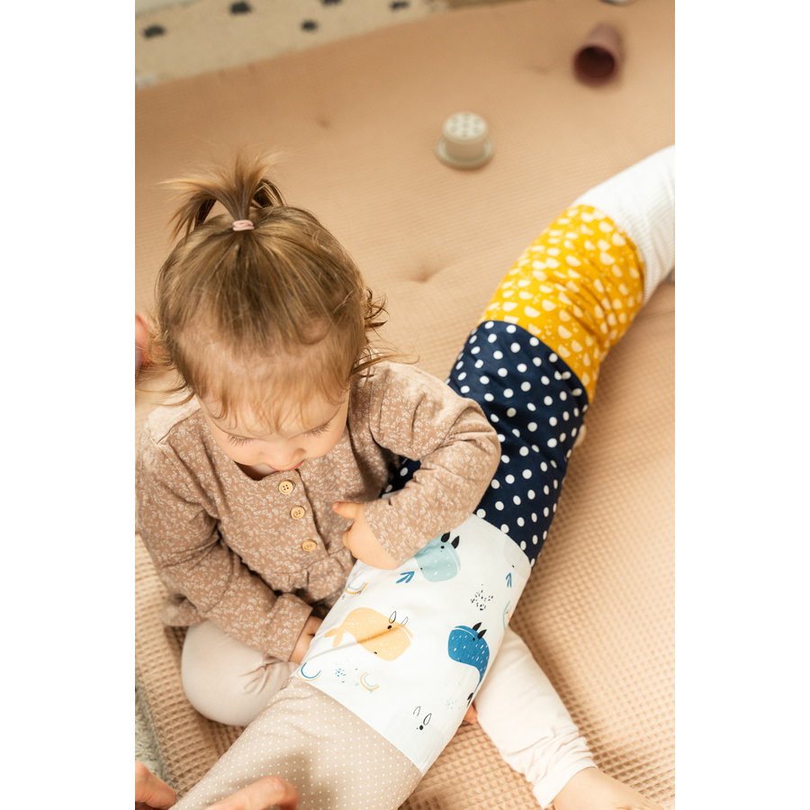 Dettagli del prodotto: Serpente da letto per bambini Flessibile, non vincolato a una forma predeterminata Nessun fruscio o altri rumori quando si sposta il serpente da letto Ha un diametro di circa 13 cm Le strisce di tessuto hanno un'altezza di circa 20 cm ciascuna. Materiale e cura: Materiale: 100% cotone Materiale interno: 100% poliestere Lavabile fino a 40°C Tessuti di cotone certificati secondo lo standard OEKO-TEX®, classe di prodotto I Dimensioni e peso: Dimensioni: 200 cm Peso: 970 g Incluso nella consegna: 1 letto a serpente
