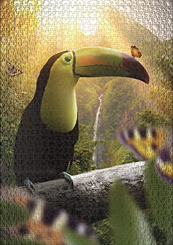 La farfalla finisce sul becco del tucano - Scopri un puzzle visionario di animali per adulti con motivo foresta pluviale