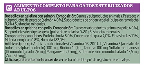 Ogni confezione multipack contiene 2 sacchetti da 85 gr con salmone e 2 sacchetti da 85 gr con pollo