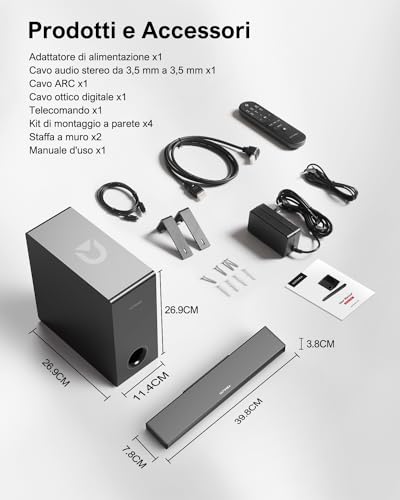 ECCELLENTE COMPATIBILITÀ: Questa soundbar supporta la connessione ARC, ottica, AUX, USB e Bluetooth 5.3, integrandosi senza problemi con una vasta gamma di dispositivi. Il tuo sistema audio completo per TV, computer, telefoni, proiettori e console da gioco, con tutti i cavi necessari per un'i