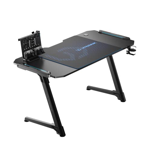 Set da gioco: Il set contiene una scrivania da gioco con illuminazione a LED, sedia da gioco ergonomica e accessori di accompagnamento alla scrivania: tappetino per mouse XXL, gancio per cuffie e portabicchieri combinati e un rack da gioco per dispositivi più piccoli.