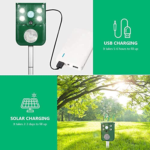 Batteria a energia solare e ricaricabile: non è necessaria una batteria aggiuntiva, questo repellente per animali può essere caricato direttamente dall'energia solare. Dotato di cavo USB, può anche essere alimentato da un adattatore o da un power bank.
