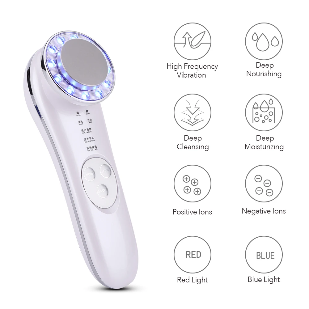 Ultrasonic Vibration Red Blue LED Light Therapy Facial Device EMS Heating Ion Frequency Anti Wrinkle Skin Lifting Beauty Machine