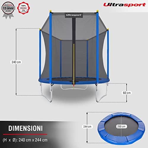 Ultrasport Trampolino giardino Uni-Jump, trampolino per bambini, Ø 244 cm, set completo di trampolino elastico comprendente tappetino salto, rete sicurezza, palo rete imbottito e copertura bordi, Blu