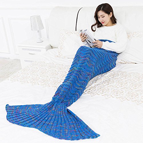 Umeicool, coperta a uncinetto per tutte le stagioni, a forma di coda di sirena, con motivo a onde, per bambini o adulti Royal Blue
