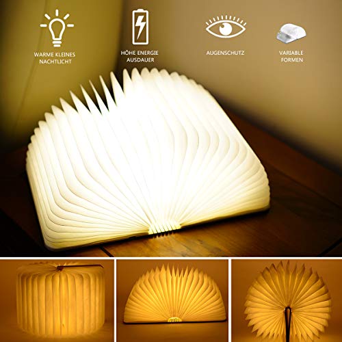 UMICKOO - Lampada da tavolo a LED, a forma di libro, luce notturna in legno, ricaricabile + copertura in legno, luce bianca calda