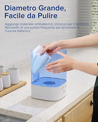 【Materiale Antibatterico e Precauzioni】 Il serbatoio dell'acqua è addizionato di materiale antibatterico, innocuo per il corpo umano anche per i bambini. Per prolungare la durata dell'umidificatore per bambini e prevenire la formazione di batteri, si consiglia di pulirlo ogni 3 giorni. Per ulteriori domande, contattare il nostro team di assistenza