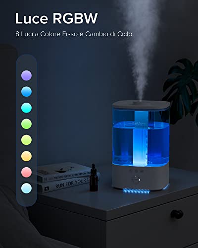 【Luce notturna RGBW e Scatola Degli Oli Separata】 È possibile scegliere tra la modalità ciclo di luce multicolore o colore fisso e aggiungere oli essenziali nella scatola separata per riempire la stanza con l'aroma preferito (non aggiungere oli essenziali direttamente nell'acqua per evitare che i residui di olio intasino gli oli essenziali dell'umidificatore)