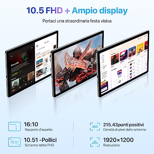 【Connettività potente】Goditi un'esperienza di multitasking senza limiti con questo tablet HD da 10 pollici, dotato di 2 slot per schede SIM e supporto OTG per collegare tastiere e mouse esterni. Grazie alla modalità schermo diviso, la produttività sarà sempre al massimo. Con Bluetooth 5.0 e WiFi 6, la connettività è garantita ovunque ti trovi. Certificato Google come i tablet Samsung, sarà compatibile con tutte le tue app preferite.