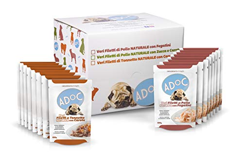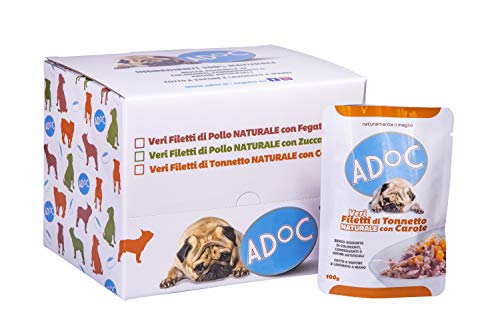 Adoc Cibo Umido per Cani con Ingredienti Naturali al 100% - Multipack da 16 Buste da 100 Gr con Pollo e Fegatini e con Tonno e Carote - 16 Buste