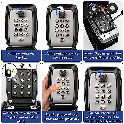 Serratura a combinazione sicura: la cassaforte chiave combinazione è progettata con un codice a 12 cifre, disponibile in molte combinazioni diverse. Nota: la combinazione originale è vuota, quando si reimposta una nuova combinazione si prega di scattare una foto per ricordarla o non sarà più possibile utilizzare la cassetta delle chiavi. Le nostre cassette non possono essere impostate con gli stessi numeri, le password possono essere aperte in ordine sparso.