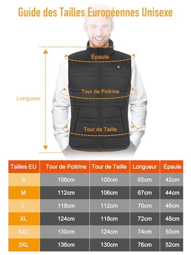 【3 Livelli di Calore & Facile da Usare】Questo giubbotto riscaldato uomo offre 3 livelli di temperatura regolabili: alta temperatura(55-65°C luce rossa), media temperatura(45-55°C luce blu), bassa temperatura(35-45°C luce verde). Puoi premere il pulsante di accensione sul petto del gilet elettrico per scegliere il calore adatto alle tue esigenze.