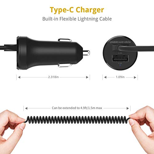 [Di ricarica rapida]: Caricabatteria da auto UNBREAKcable contemporaneamente poteri per due dispositivi a tutta velocità con 2.4A in ogni porta USB. Con una potenza totale di 4.8A, questo caricabatterie auto con una porta USB e un cavo di tipo C funziona bene con tutti i dispositivi USB abilitati.