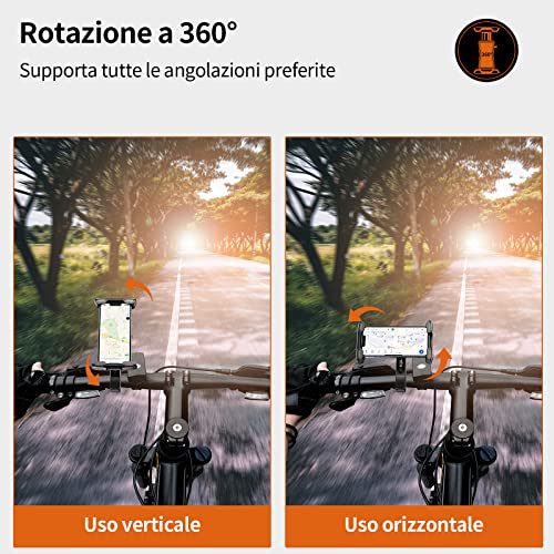 【Sicuro & Stabile】 Il portacellulare da bici è fatto di gel di silice, Materiale PC e un braccio in acciaio inossidabile 301 appositamente progettato per proteggere il tuo telefono. Il morsetto del manubrio è rinforzato con gomma dura antiscivolo per una presa più solida per resistere a urti e cadute anche su percorsi accidentati. I 4 angoli con cuscinetti in silicone avvolgono completamente il telefono per assorbire le vibrazioni e rafforzare la protezione.