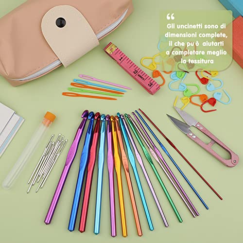 Set uncinetti ergonomici, Kit di accessori da 52 pezzi, completo in alluminio di 14 dimensioni, segnapunti, aghi a cruna grande e custodia