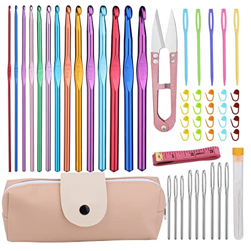 Set di uncinetti in alluminio: Il kit di aghi per uncinetto include 14 uncinetti in alluminio (2,0 mm-10,0 mm), 20 segnapunti, 9 aghi a cruna grande, 5 aghi a cruna grande in plastica, forbici per filati, metro a nastro e custodia. Il set completo all'uncinetto soddisfa una varietà di esigenze di lavoro a maglia, rendendo la tua creazione più comoda e veloce.