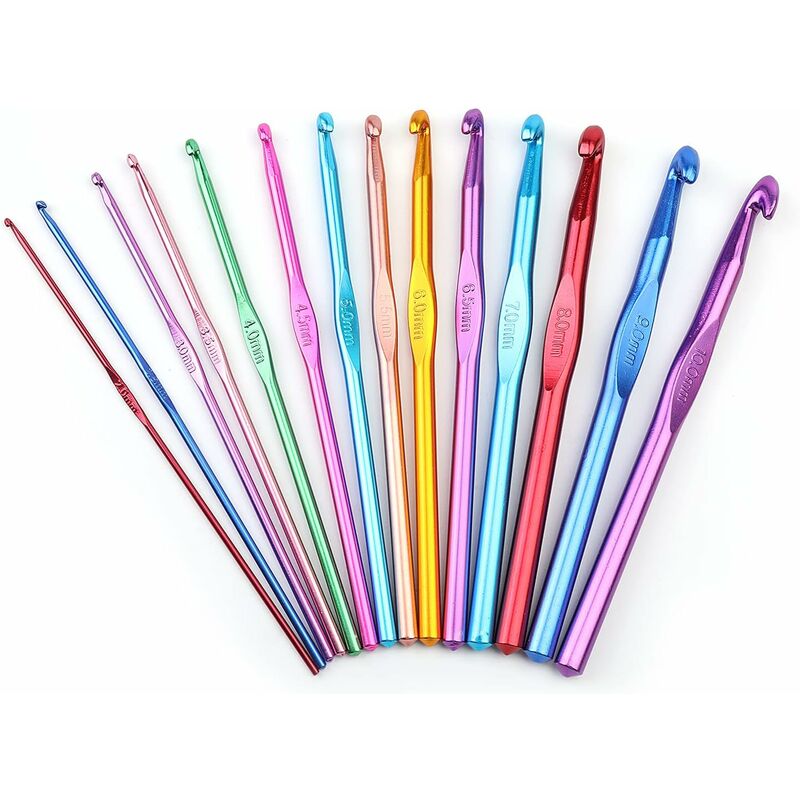 Set per uncinetto: comprende 14 misure di ferri da maglia in alluminio (2 mm / 2,5 mm / 3 mm / 3,5 mm / 4 mm / 4,5 mm / 5 mm / 5, 5 mm/6 mm/6,5 mm/7 mm/8 mm /9mm/10mm), soddisfa le tue diverse esigenze. Design accurato: ci sono dimensioni corrispondenti contrassegnate sui manici e i diversi colori di ciascun ago in alluminio ti aiutano a distinguere la dimensione del gancio, comodo da scegliere e uso. Materiale superiore: i nostri ganci sono realizzati in alluminio di alta qualità, resistenti e robusti, possono essere utilizzati a lungo. Le punte lisce non si impigliano mai nel filo, i manici sono comodi. Regalo perfetto: Il set di uncinetti è un regalo perfetto per chi ama l'uncinetto, ottimo da regalare ai tuoi amici o alla tua mamma a Natale, compleanno o altri festival, da non perdere. Buon aiutante all'uncinetto. Applicabile a tessuti manuali, artigianali, all'uncinetto e altri campi. Ganci di diverse dimensioni aiutano a ridurre il movimento del polso per strumenti essenziali