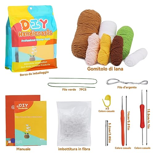 Kit completo per uncinetto: il pacchetto completo di materiali per uncinetto per principianti include 8 colori di filato, 1 imbottitura in fibra, 5 segnapunti (colore casuale), 1 ago grande con cruna smussata, 1 uncinetto doppio (colore casuale), 1 morbido uncinetto con gambo 2,5 mm, 7 fili di ferro verde, 1 rotolo di filo bianco, 1 x istruzioni, 1 x libretto con video tutorial.