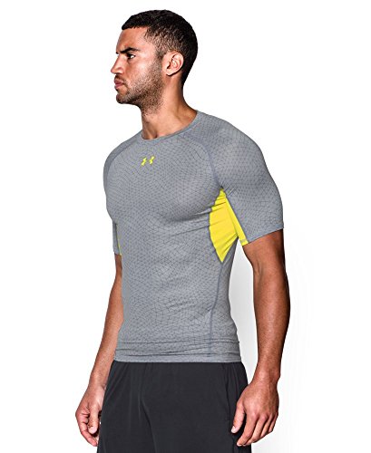 Under Armour UA HeatGear Printed, Maglietta a Compressione da Uomo, Grigio/Giallo, Taglia L