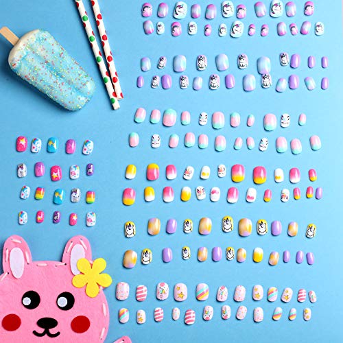 164 Unghie Bambini Unghie Finte Stampa Copertura Completa Glitter Sfumato Colore Ragazza Unghie Finte Corte 7 Giorni a Tema Unicorno Unghie Finte Carine per Bambini Unghie Bambine, 7 Scatole