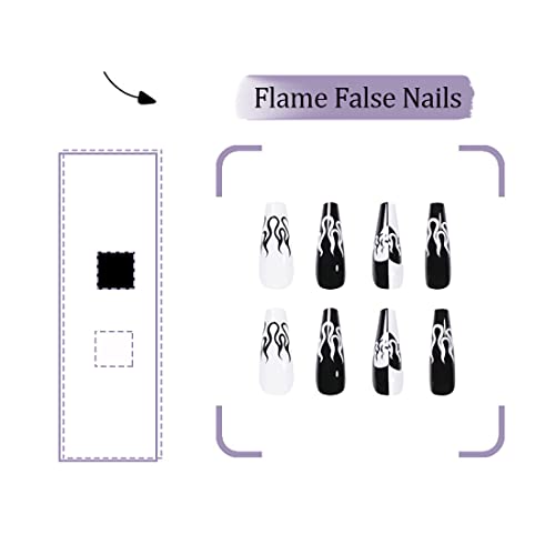 【Design unico】: Unghie finte in bianco e nero con design a fiamma, forma di ballerina a copertura totale, combinano elementi di tendenza con colore e forma classica, sembra lucido e attraente.