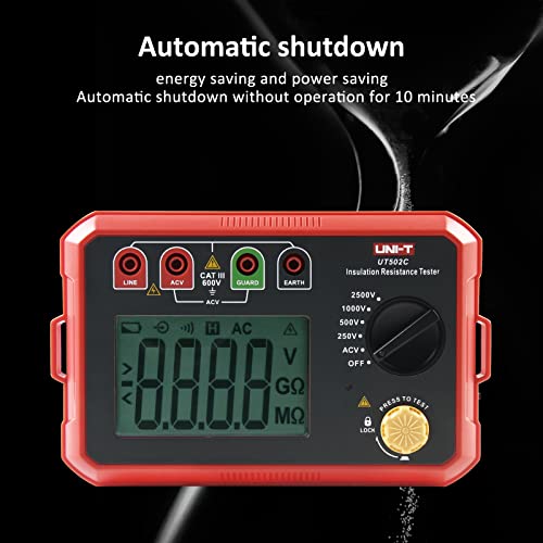 【Multifunzione】Uscita in tensione 2500 V, portata massima 20,0 GΩ. Ci sono quattro tensioni di uscita tra cui scegliere.Supporta la funzione autobloccante, indicatore di batteria scarica,Blocco dati, allarme sonoro e luminoso, indicazione fuori portata e funzione di retroilluminazione LCD. Supporta anche lo spegnimento automatico dopo 10 minuti di inattività, risparmio energetico e sicurezza.