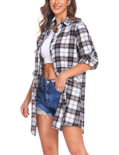 UNibelle Camicia da donna a quadretti, a maniche lunghe, estiva, con maniche regolabili, per il tempo libero, S-XXL, Bianco non dritto, L