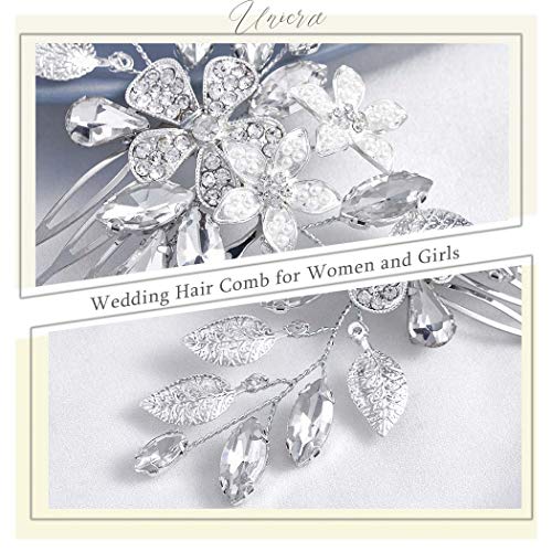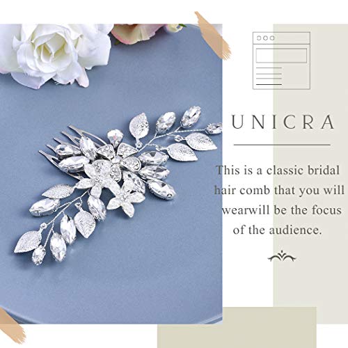 Unicra - Pettine per capelli da sposa in argento, con fiore e cristalli, accessorio per capelli per donne e ragazze