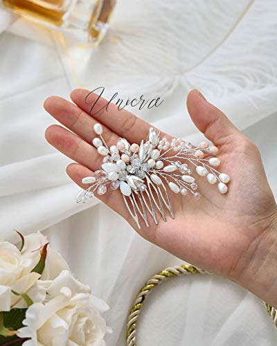 Unicra - Pettine per capelli da sposa in argento, con perle e strass, per donne e ragazze