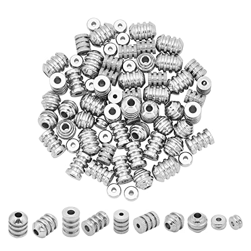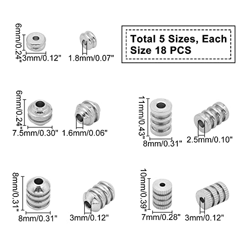 5 diverse dimensioni: colore acciaio inossidabile, circa 6~11 mm di lunghezza, 3~8mm di diametro, hole 1.6-3 mm. 90 pezzi (18 pezzi / misura) perline di forme miste in acciaio inossidabile, quantità sufficiente per l'uso quotidiano.