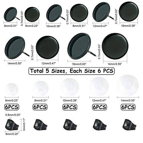 UNICRAFTALE 30 Set 5 Misure 6/8/10/12/14mm Nero Orecchino Castone con Cabochon Vetro Trasparente in Acciaio Inox Orecchino A Bottone Cabochon Impostazione Piatto Rotondo Castone Vassoio per Gioielli
