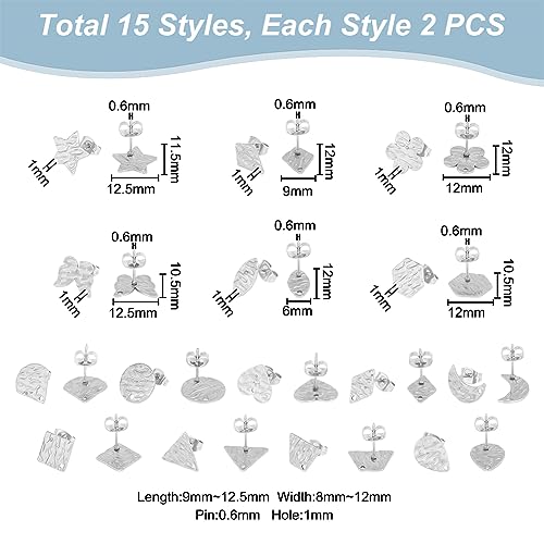 UNICRAFTALE 30 pz 15 Orecchini A Bottone Testurizzati Stile 304 Orecchini A Bottone Esagonali in Acciaio Inossidabile Orecchini Ipoallergenici Stella Luna Accessori per Orecchini Fai da Te con Anello