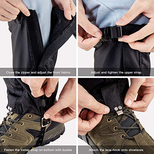 Doppio Rinforzo: La ghette da escursionismo con doppia apertura con cerniera e velcro, facile da indossare e da togliere, cintura regolabile nella parte superiore, fascia elastica al centro della gamba, cintura spessa in TPU nella parte inferiore, fibbia ad ardiglione in metallo, gancio in metallo per fissare il piede L'estremità anteriore si adatta alla tomaia ed è progettata per evitare che i gambali scivolino e si allentino per adattarsi meglio alle gambe.
