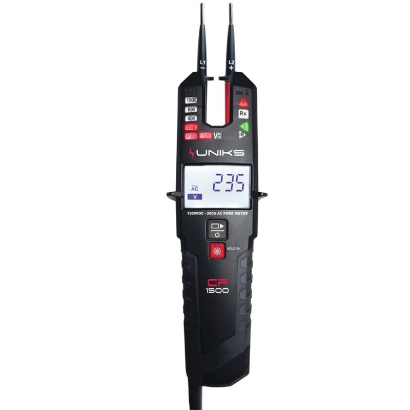 DUSPOL A PINZA 1000V AC 1500V DC 20 CF 1500 Tester a due poli per misura di tensione AC fino a 1000 V o DC fino a 1500 V . Grazie al pratico toroide a forcella integrato è possibile misurare correnti fino a 200 A AC anche in spazi angusti . Inoltre incorpora funzione di rilevamento tensione con vibrazione oltre che con i led, senso ciclico delle fasi, polarità, continuità e resistenza. Il tester è estremamente sicuro e permette il rilievo della presenza di tensione anche senza le batterie o con pile scariche garantendo una maggiore sicurezza dell'operatore ( norma EN61243-03:2014) Dotato di torcia per illuminare ambienti bui CATEGORIA DI MISURA CAT IV / 600 V TEST DI TENSIONE AC E DC FINO A 1000 V CON LED TEST CORRENTE FINO A 200 A AC TEST DI TENSIONE AC FINO A 1000 V E TEST DI TENSIONE DC CERCA INTERRUZIONE CAVO CON RILEVATORE DI TENSIONE INDICAZIONE DI POLARITÀ CERCAFASE A UN PUNTALE SENSO CICLICO DELLE FASI E CONTINUITÀ RESISTENZA FREQUENZA VIBRAZIONE ON/OFF AUTOMATICO TORCIA