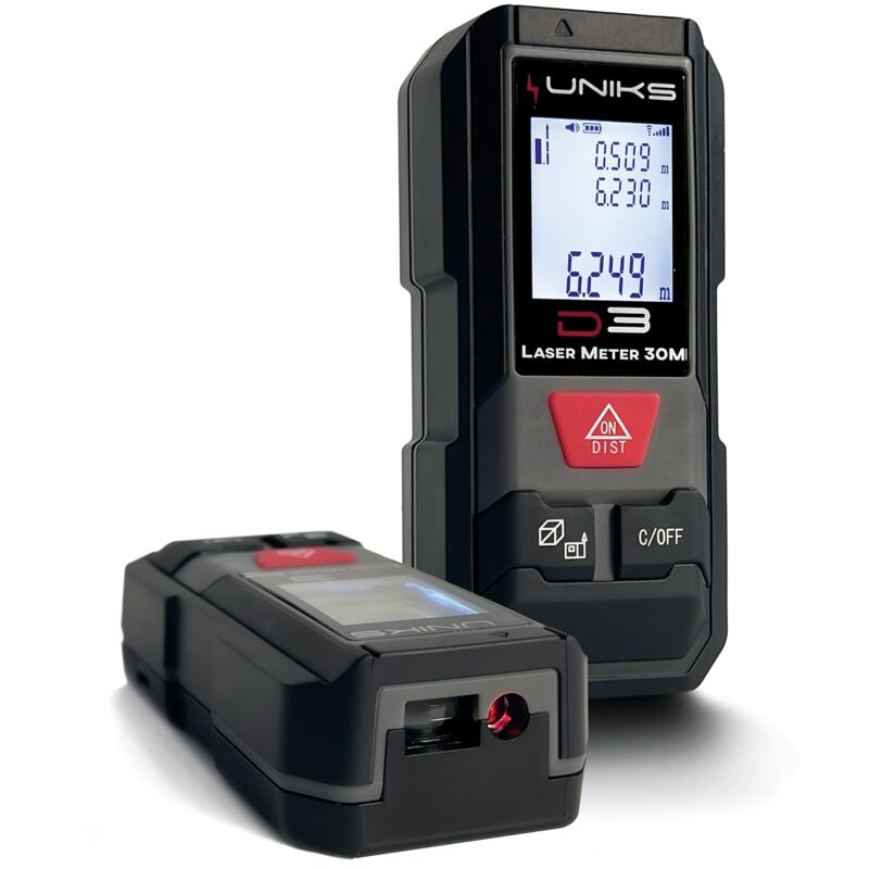 Misuratore metro laser 30 metri Uniks D3 D3 permette di misurare facilmente distanze di 30M con una precisione di 5mm e tramite algoritmi interni permette di effettuare misure di Area, Volume. PITAGORA E DOPPIO PITAGORA Per determinare la lunghezza in ambienti difficili da raggiungere D3 permette di utilizzare il metodo Pitagora, quindi eseguendo due misure di distanza la terza sarà determinata dallo strumento D3. Misure di distanze maggiori saranno eseguite con il metodo del Doppio teorema di Pitagora. Funzioni: Modalità di misurazione continua Interruttore Benchmark Misura dell'area Misurazione del volume Misura Pitagorica