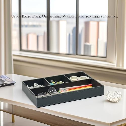 UnionBasic Vassoio piatto da scrivania in pelle con 4 scomparti, per cancelleria, articoli vari, gadget, organizer per penne, matite, elegante colore grigio
