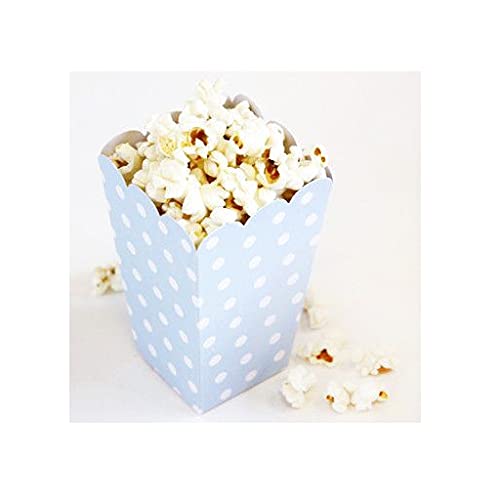 Scatole popcorn sorpresa a pois azzurro misurano circa 14 cm x 10 cm