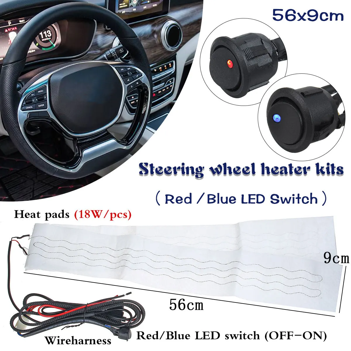 Universal Car Front Flocking Cloth Steering Wheel Heater Kits Car Heat Pads Car Heater 56cm x 9cm Blue/Red Light