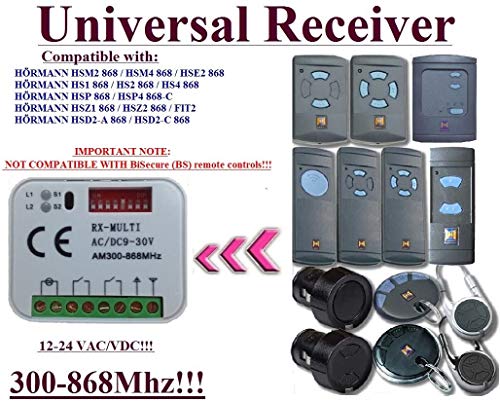 Universale ricevitore Compatibile con Hormann 868,3Mhz HS1 / HS2 / HS4 / HSE2 / HSM2 / HSM4 / FIT2 / HDS2-A 868 / HSD2-C 868 / HSZ1 868 / HSZ2 868 / HSP4 868 / HSP4-C 868 Telecomando radiocomando. Rolling codice 2-canale 300Mhz-868Mhz. Rolling / Fixed code 12 - 24 VAC/DC receiver.