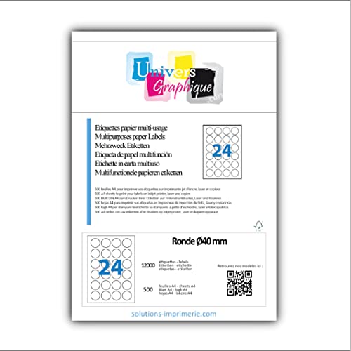 UniversGraphique, 12000 Etichette Adesive Rotonde su Fogli A4, Colore Bianco, Diametro 40 mm, Fogli 500, 24 Etichette per Foglio