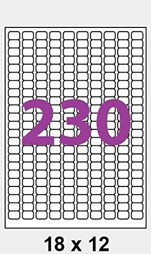 23000 etichette, dimensioni 1.8 x 1.2 cm, fogli A4. Fogli adesivi bianchi opachi.